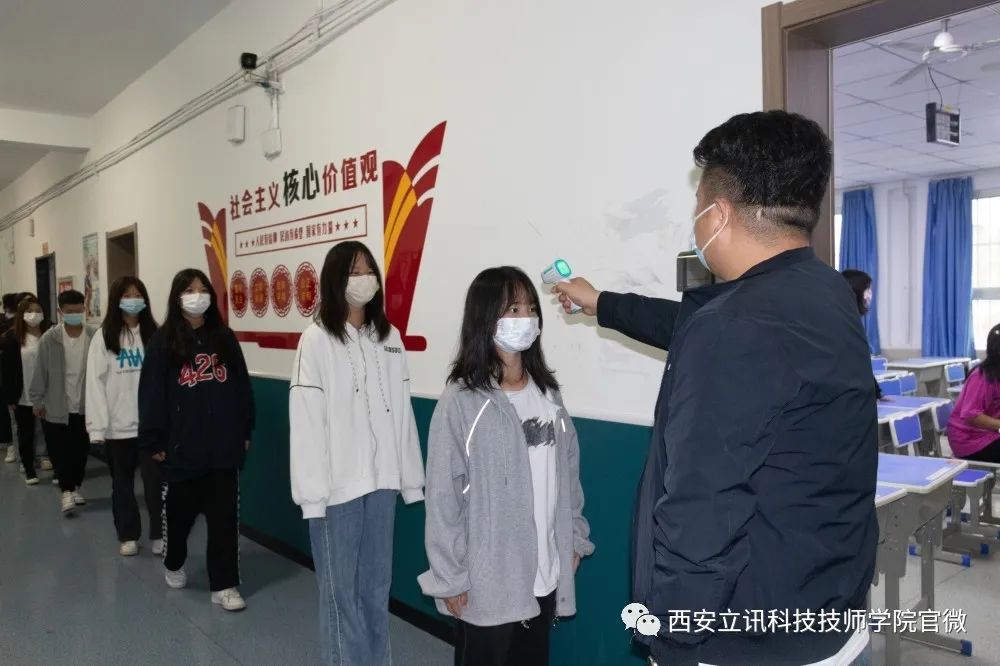西安立讯科技技师学院要求所有学生上课前,需进行测温、消毒后方可进入教室,上课期间,各个教室、实训室全程开窗户、开门进行通风。上课期间所有师生需正确佩戴口罩。对各个教室、实训室每日定时进行2次以上消杀工作,并做好记录。若上课期间,有学生出现异常症状,由代课老师及时向学院疫情防控总指挥报告情况,由专业人员将其引导至学院隔离观察室,并组织其他学生有序撤离教室,对教室及通道实施消毒处理。