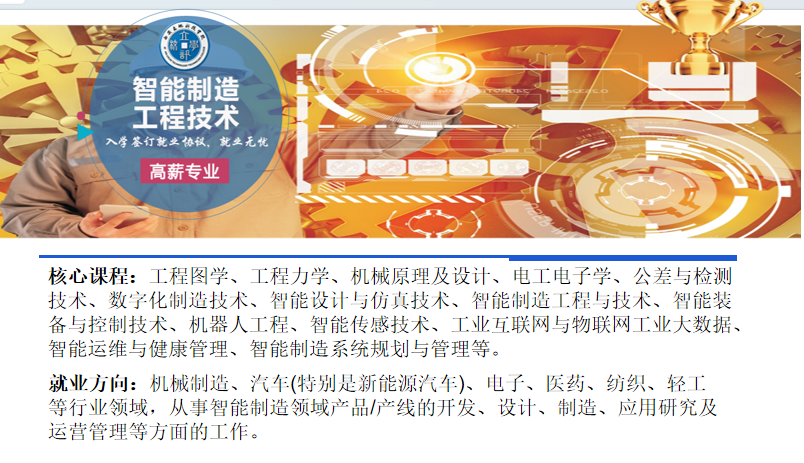 就业方向:主要在机械制造、汽车(特别是新能源汽车)、电子、医药、纺织、轻工等行业领域,从事智能制造领域产品/产线的开发、设计、制造、应用研究及运营管理等方面的工作。