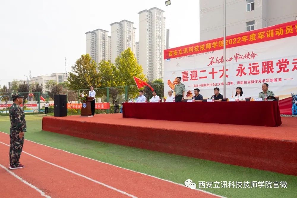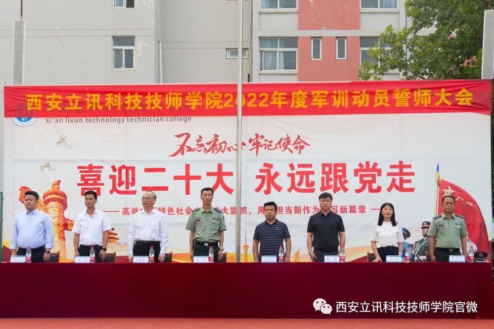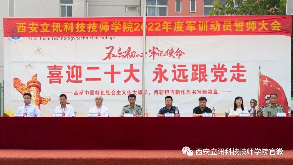 国旗飘扬,铸钢铁意志;军姿挺拔,展迷彩风采。8月11日上午,西安立讯科技技师学院2022年度军训动员誓师大会在运动场隆重举行,我院常务副院长暨军训团团长刘军,副院长王春龙、苟春辉、张伟,工会主席余峰,招办主任吴静,学生处处长胡凯歌,军训团参谋长聂建清,全体参训教官,部分教师代表,2022级全体新生共同参加了大会。